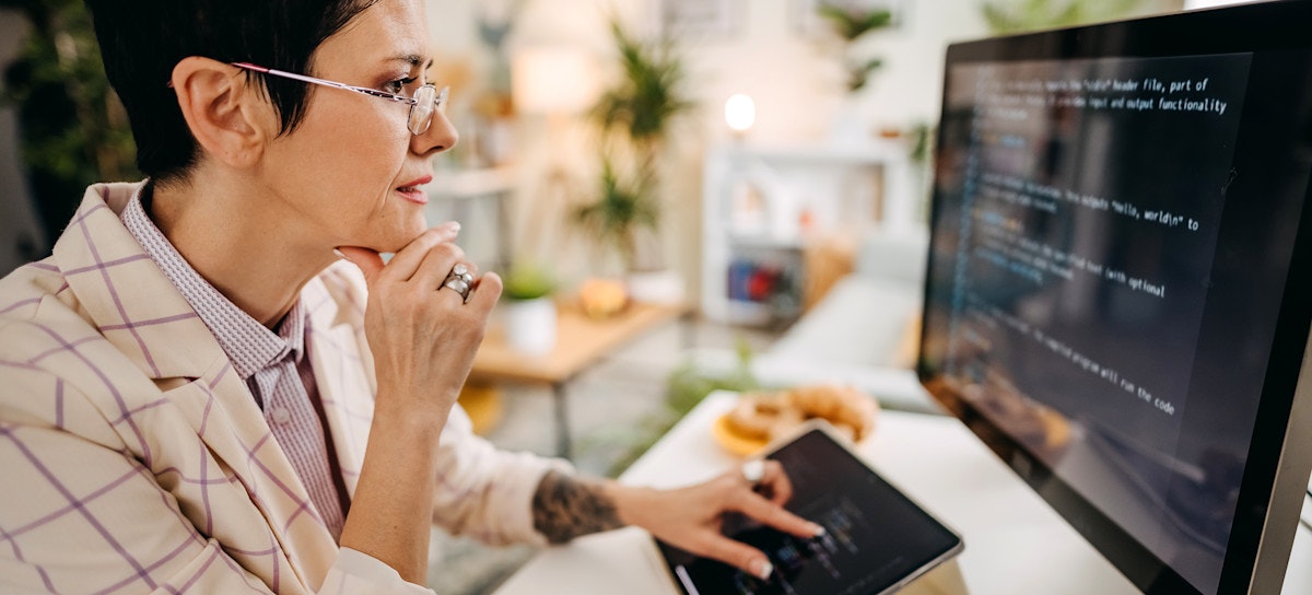 [Featured Image] A build engineer looks over some code using a tablet and a computer while sitting at a desk.