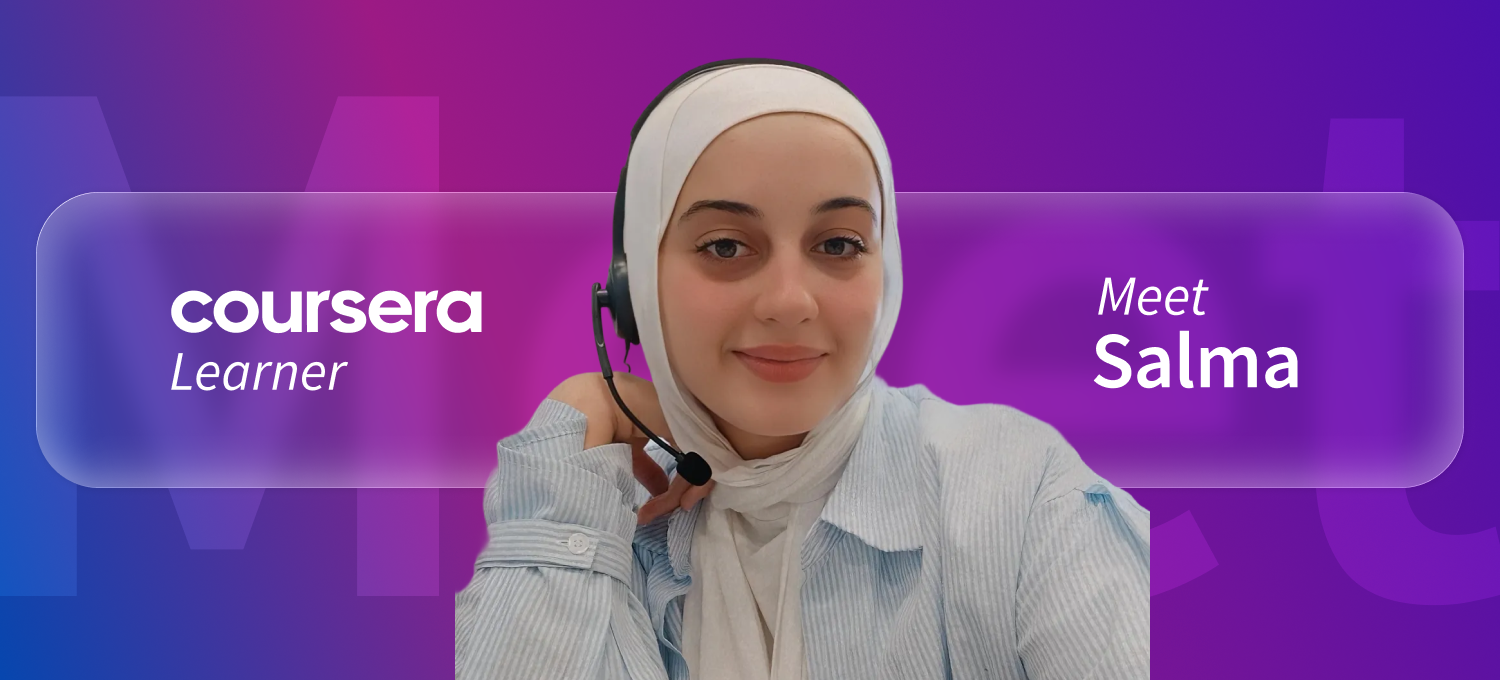 [Featured image] Coursera learner Salma sits in front of a mixed-color background of blue, pink, and purple with the word "Meet" faintly visible behind her. The words "Coursera Learner" are on her left and "Meet Salma" are on her right.